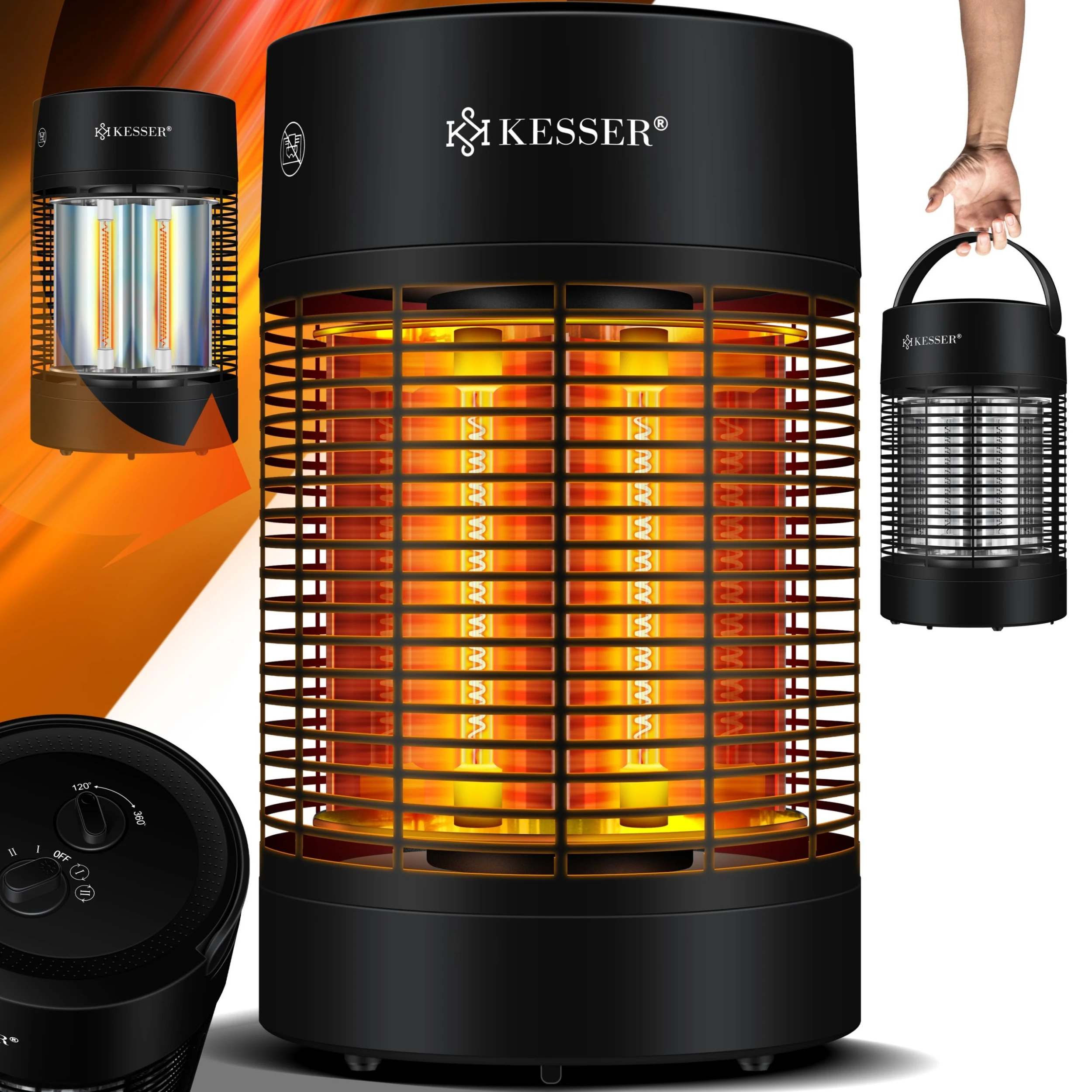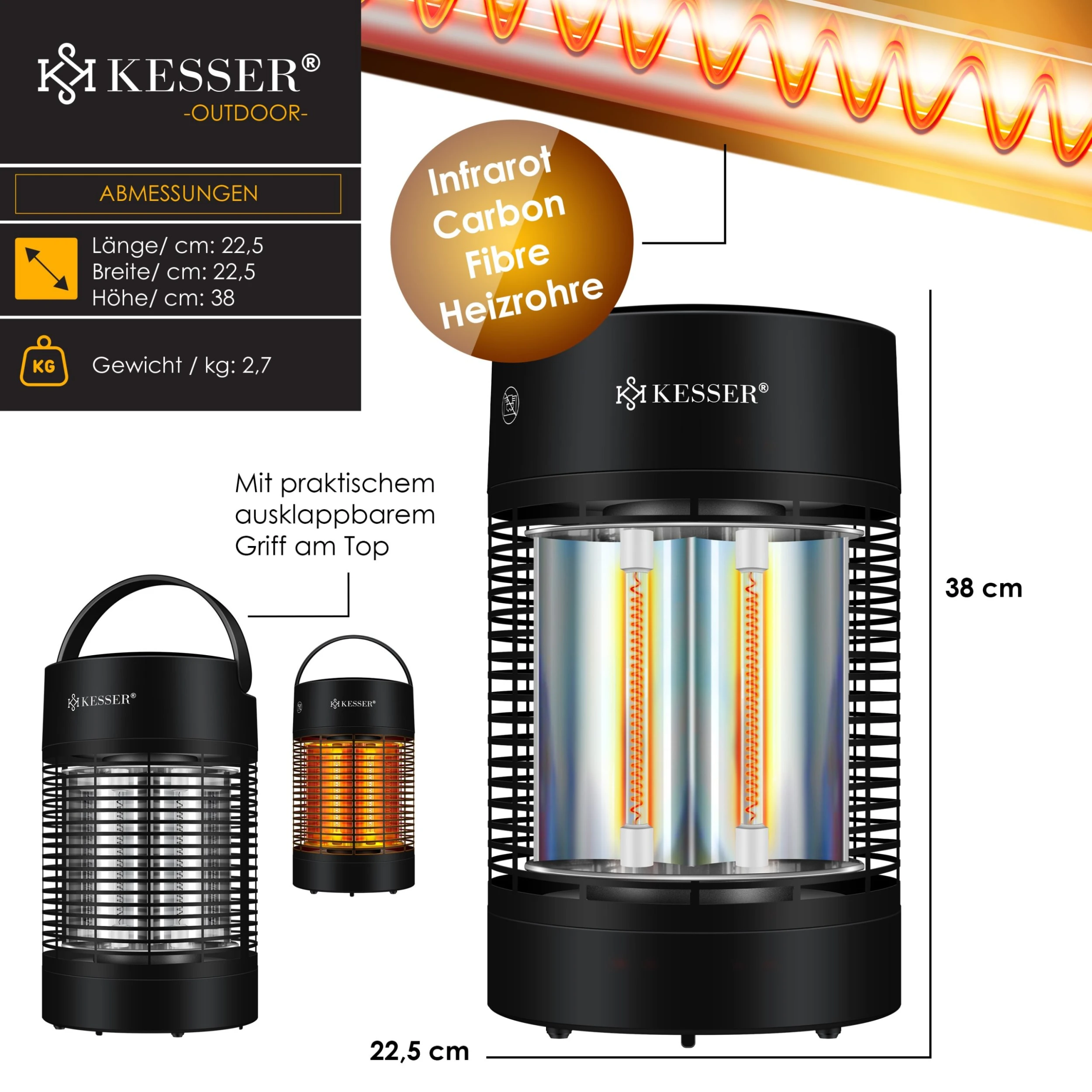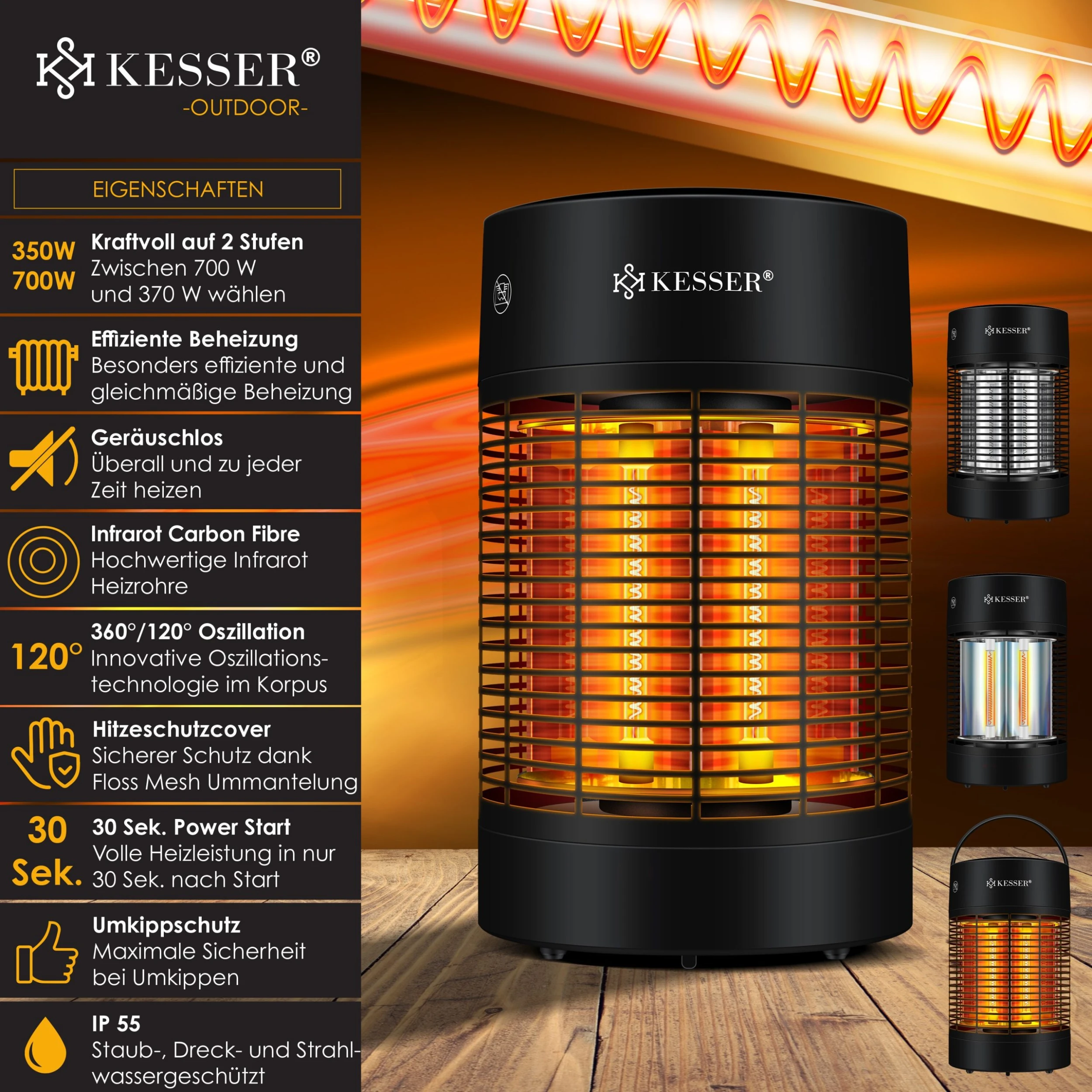 KESSER Standheizer mit zwei kraftvollen Stufen für eine effiziente und gleichmäßige Beheizung dank hochwertigen Infrarot Heizrohren, 120°-360° Oszillation und geräuschlos, Hitzeschutzcover, volle Heizleistung in nur 30 Sekunden, Umkippschutz sowie IP 55 geschützt