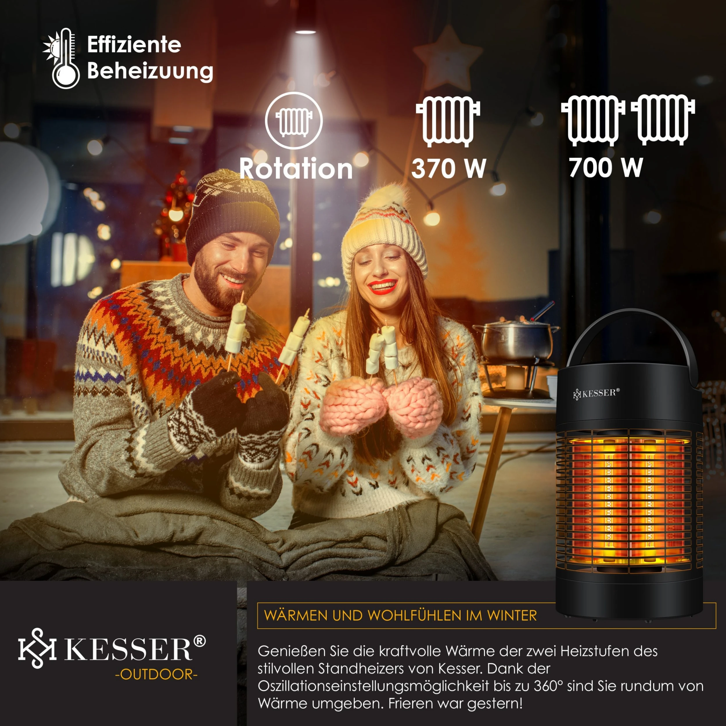 Die KESSER Wärmeheizung ist aufgrund seiner hohen Qualität zu einer idealen Wahl für den privaten und gewerblichen Gebrauch geworden. Mit dem eleganten Design, der hochwertigen Verarbeitung und den effizienten Funktionen eignen sich unsere Elektro-Heizungen sehr gut für den modernen Außenbereich oder die Gastronomie. Dank der angenehmen und sonnenähnlichen Strahlungswärme können Ihre Gäste, Freunde und Familie auch bei feucht–kaltem Wetter draußen sitzen. Stellen Sie den Heizofen ganz einfach und flexibel an Ihren Wunschort. Mit unserem Wärmestrahler aus dem Hause KESSER erreichen Sie eine unvergleichbare Atmosphäre für Sie und Ihre Gäste.